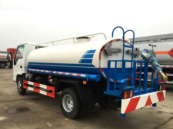 灑水車前裝有鴨形噴嘴或圓頭沖嘴,后面裝有圓柱開灑水噴嘴或蓮蓬頭噴嘴,后部有一工作平臺,裝配有水炮。后部還可裝8個噴嘴(選裝)。