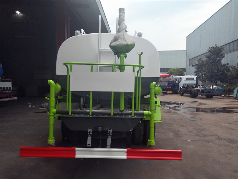 灑水車專用部分由罐體、水泵、取力器、傳動軸、球閥、噴灑裝置等部件組成。罐體采用4mm厚武鋼專用板材制作,實際容積11.8立方,該灑水車標(biāo)配前沖(噴)后灑,灑水寬度≥14米,帶側(cè)噴,罐體后帶工作平臺,平臺上安裝綠化灑水炮,灑水炮可全方位旋轉(zhuǎn),射程≥28米,可連續(xù)調(diào)成直沖狀、大雨、小雨、毛毛雨,帶安全護(hù)欄,配備專用灑水泵,泵可自吸自排,安裝過濾網(wǎng),帶消防接口,可通過消防栓進(jìn)水,帶自流閥,具有自吸自排功能,垂直吸≥7米