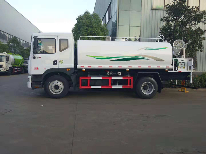 東風多利卡D9噴霧抑塵灑水車_抑塵車多少錢一輛;我公司生產的東風多利卡D9噴霧抑塵灑水車下線檢測了。車款車型選用東風多利卡D9系列單橋底盤,3950mm軸距,新款排半駕駛室,康明斯ISB180 50六缸發動機,國五排放,250mm車架,氣制動,動力轉向,離合助力,空調,電動窗,中控鎖,ABS,8噸后橋,4噸前橋,東風六檔變速箱,9.00R20鋼絲胎。選配30米噴霧抑塵機。罐體用5MM碳鋼板制作,罐內隔板具有防波作用,以減低汽車行駛時罐體液體的沖擊。整車帶一個專用灑水泵(垂直吸程6米),灑水寬度14米,射程28米。多功能灑水車配備2個前沖(噴)(能將路面泥巴、塵土、垃圾沖干凈);2個后灑(能均勻地將水灑在路面,一次灑水寬度14米)、2個側噴(花灑)(能均勻地將路旁綠化帶澆灌)、帶1個后工作平臺,平臺上安裝1個綠化灑水高炮(灑水炮可全方位旋轉,可連續調成直沖狀、大雨、小雨、毛毛雨,霧狀可調節沖洗高大樹木),引水時間<5min,流量90m3/h。帶1個消防接頭,帶1個自流閥,1個過濾裝置、人性化爬梯及側防護欄,安裝灑水音樂喇叭。
