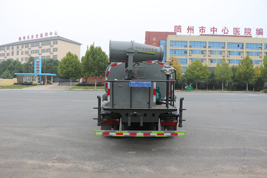 抑塵車罐體用4MM碳鋼板制作,罐內隔板具有防波作用,以減低汽車行駛時罐體液體的沖擊。整車帶一個專用灑水泵(垂直*大吸程9米),灑水寬度14米,射程28米。多功能灑水車配備2個前沖(噴)(能將路面泥巴、塵土、垃圾沖干凈);2個后灑(能均勻地將水灑在路面,一次灑水寬度14米)、2個側噴(花灑)(能均勻地將路旁綠化帶澆灌)、帶1個后工作平臺,平臺上安裝1個綠化灑水高炮(灑水炮可旋轉,可連續調成直沖狀、大雨、小雨、毛毛雨,霧狀可調節沖洗高大樹木)。帶1個消防接頭,帶1個自流閥,1個過濾裝置、人性化爬梯及側防護欄,安裝灑水音樂喇叭。