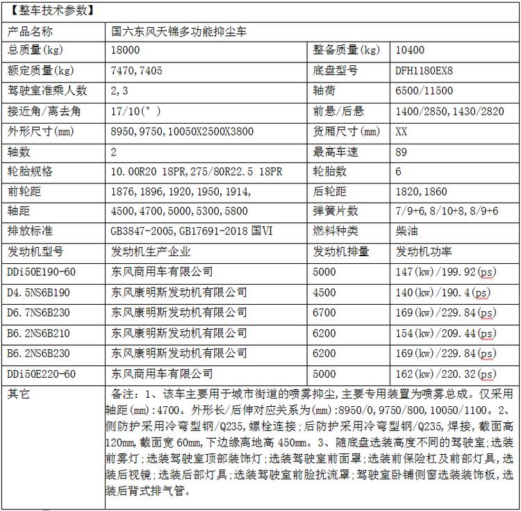 東風天錦霧炮車,又稱:多功能抑塵車,霧炮灑水車,是在普通灑水車的基礎上加裝帶獨立動力的環保風送式噴霧機組組成的。其罐體容積:10-12立方,可選裝霧炮的水平射程:30-80米。該車外形靚麗美觀,標配灑水車全部噴灑功能(前沖/后灑/側噴/高壓水炮/灑水泵可自吸自排),實車公告,解決車輛上戶超重問題,環保免征公告齊全,上牌可免交車輛購置稅。