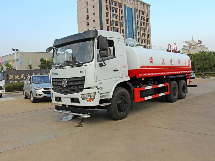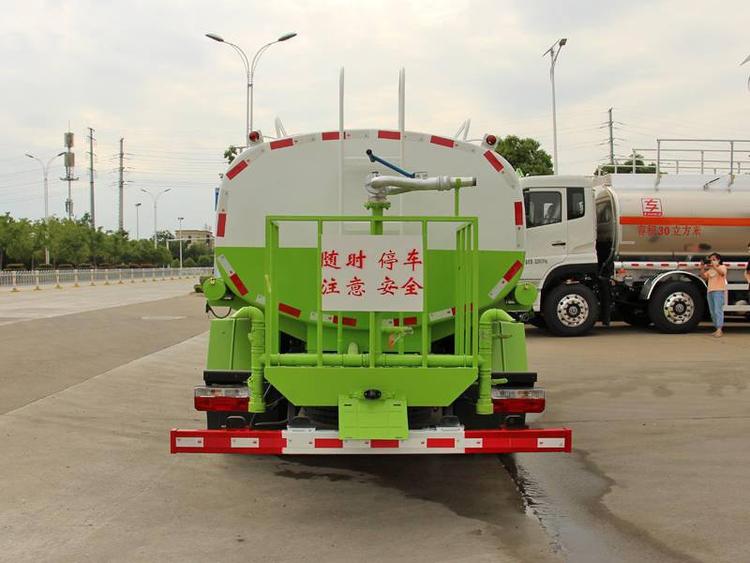 具有前沖、后灑、側(cè)噴(更換噴頭后變?yōu)閭?cè)花灑)、后置式工作平臺(帶踏梯,四周有安全護欄)、平臺上設(shè)置有高壓水炮(可360°旋轉(zhuǎn),可調(diào)成柱狀,射程28米;也可調(diào)成霧狀,射程14米,可連續(xù)調(diào)成:直沖狀、大雨 、中雨、小雨、毛毛雨),整車灑水寬度大于14米。配備大功率灑水泵,取力器,雜物過濾網(wǎng),通用65型消防接口(可通過消防栓加水)、1套自流球閥系統(tǒng)(可自吸自排,垂直吸程6.5米),2根引水鋼絲膠管(帶陰陽快速接頭),配鎖,水位計,作業(yè)高音喇叭。兩側(cè)及后加強型保險杠,防滑爬梯,膠管儲存筒。