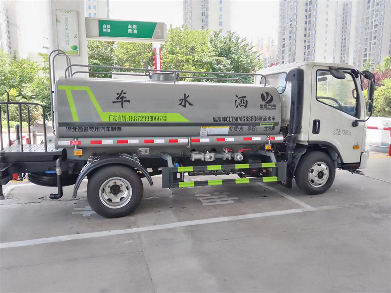福田5噸灑水車產品主要技術參數 序號 名稱 型號、規格 1 整車型號 CLT5070GSSEQ6 型灑水車 2 發動機型號 Q28-130C60 3 發動機馬力/功率 全柴 130 馬力/96KW 4 發動機排量 2800ML 5 變速箱 法士特 5 檔 6 輪胎規格 7.00 鋼絲胎 7 軸距 3360 8 總質量 7360KG 9 整備質量 3220KG 10 額定載質量 3945KG 11 整車尺寸(長×寬×高) 6.25*1.98*2.4 12 罐體容積 5 方 13 燃料種類 柴油 14 排放標準 國六 15 水泵型號 40/50 16 罐體材質 Q235 碳鋼