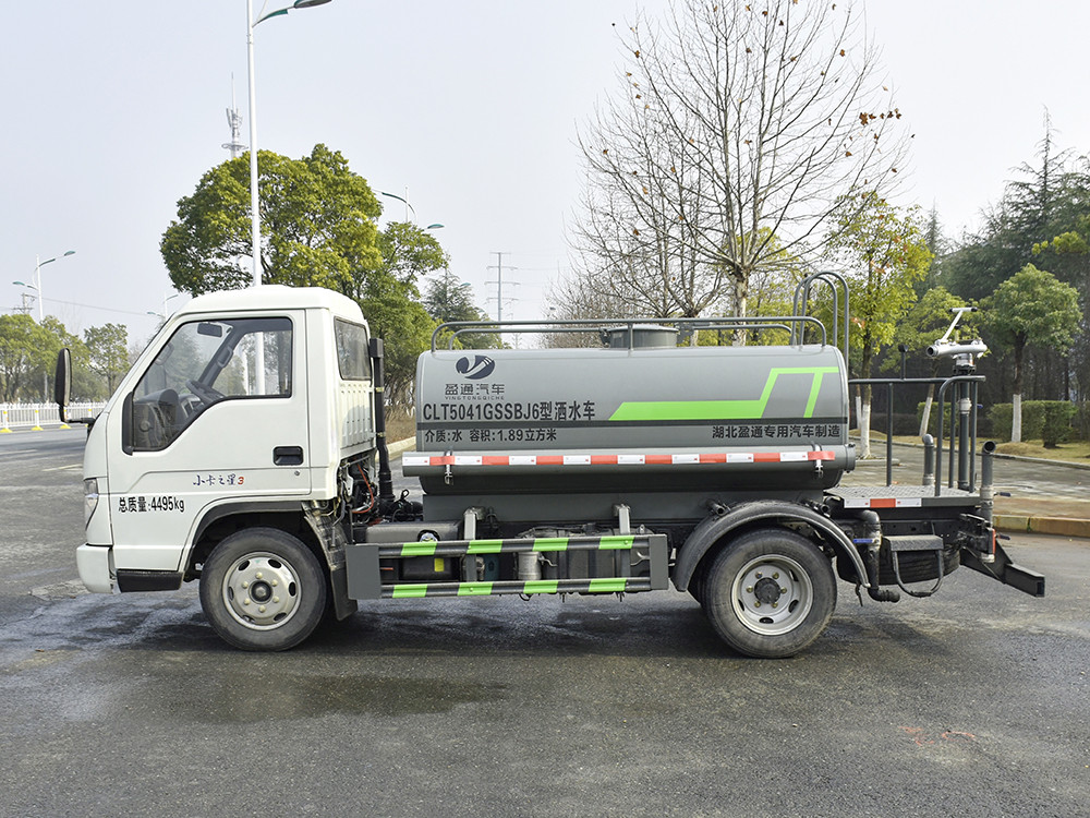 福田小卡 3 方小型灑水車產(chǎn)品主要技術(shù)參數(shù) 序號 名稱 型號、規(guī)格 1 整車型號 CLT5041GSSBJ6 型灑水車 2 發(fā)動機(jī)型號 Q23-115C60 3 發(fā)動機(jī)馬力/功率 全柴 115 馬力/85KW 4 發(fā)動機(jī)排量 2300ML 5 變速箱 萬里揚(yáng) 5 檔 6 輪胎規(guī)格 6.50 鋼絲胎 7 軸距 2850 8 總質(zhì)量 4495KG 9 整備質(zhì)量 2560KG 10 額定載質(zhì)量 1805KG 11 整車尺寸(長×寬×高) 5.47*1.98*2.2 12 罐體容積 2.2 方 13 燃料種類 柴油 14 排放標(biāo)準(zhǔn) 國六 15 水泵型號 40/50 16 罐體材質(zhì) Q235 碳鋼四. 產(chǎn)品功能展示 后對沖 后灑 側(cè)噴 高炮