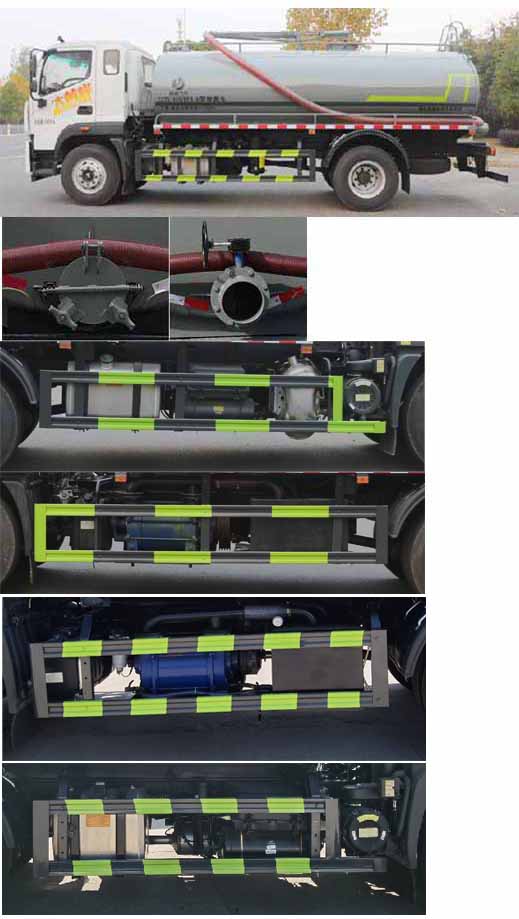 主要專用裝置:罐體及吸糞裝置總成,主要用于抽排運污水、糞便、泥漿等液態污物;罐體總容量:12.34立方米;罐體有效容積:11.73立方米;罐體外形尺寸(長×長軸×短軸)(mm):5200×2350×1500,4400×2350×1600;側、后防護材料均為:Q235碳鋼,連接方式均為:螺栓連接,后部防護截面尺寸(mm):120×50,后部防護離地高度(mm):470;ABS系統型號:ABS-VI.E;生產企業:廣州瑞立科密汽車電子股份有限公司.ABS系統型號:ABS-E;生產企業:威伯科汽車控制系統(中國)有限公司,ABS系統型號:3550D-1010;生產企業:東科克諾爾商用車制動系統(十堰)有限公司.采用4500,3950mm軸距.選裝側部及后部出口樣式;隨底盤選裝限速裝置,限速90km/h.選裝尿素罐位置,選裝電瓶位置。