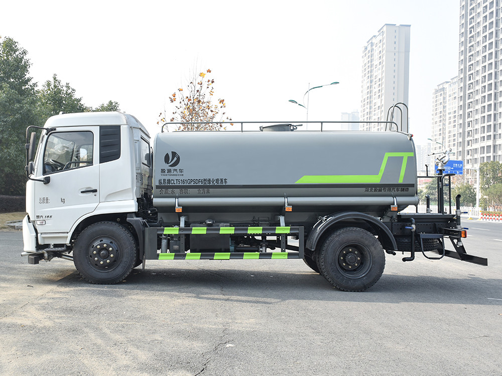 灑水車產品標配前噴(鴨嘴)、后沖、后灑、側噴、后置式工作 平臺,平臺上配置綠化水炮(可 360°旋轉,既可以調成柱狀,也可 以調成霧狀,更可以調成直沖狀、大雨、中雨、小雨、毛毛雨),配 備優質大功率專用灑水泵(可自吸自排,可從河里或池塘抽水到罐體), 取力器,雜物過濾網,消防接口,自流球閥系統、取力器、球閥、濾網 均為國家標準產品,主管道加粗,法蘭墊、法蘭盤加厚,大通徑球閥。 整體具備性能優良安全可靠、效率高、流量大、維修方便等特點