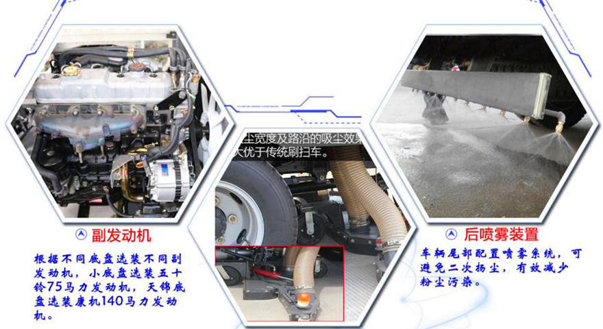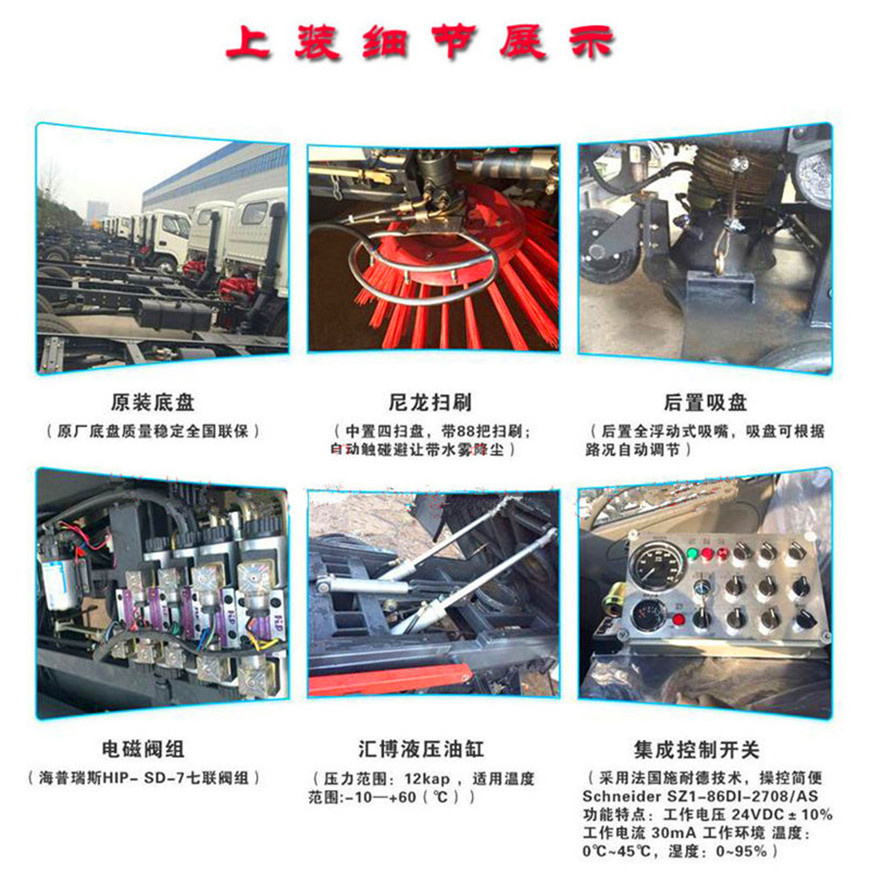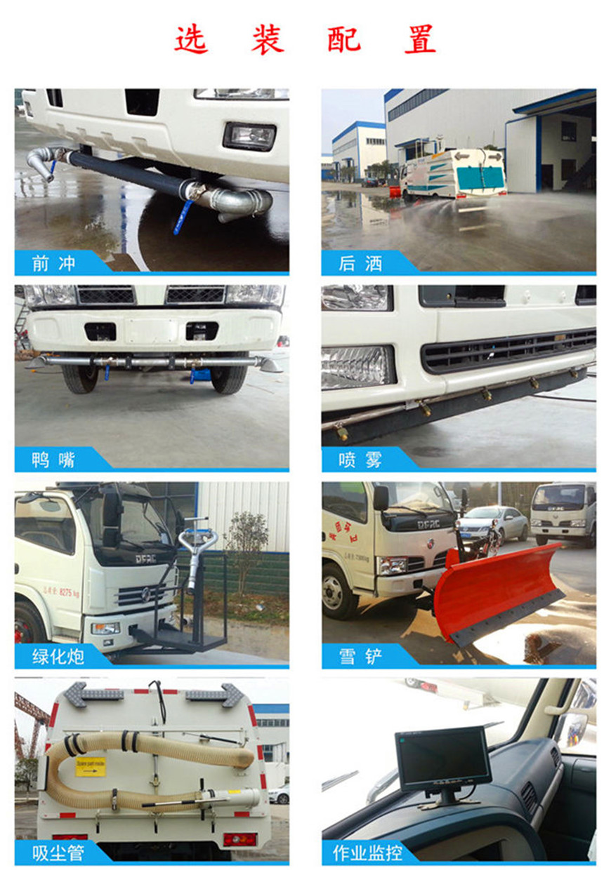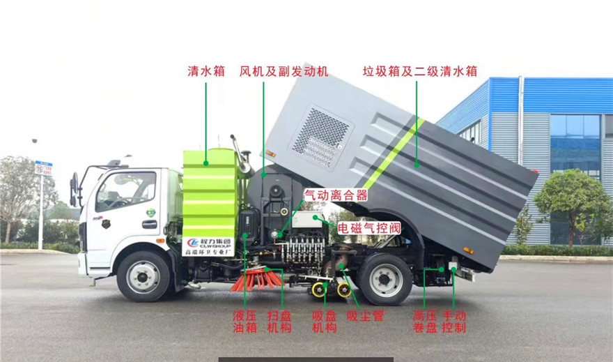 東風(fēng)8方洗掃車采用東風(fēng)型國五二類底盤改裝,加裝副發(fā)動機(jī)、風(fēng)機(jī)、高壓水泵、清水箱、垃圾箱、左右立掃、帶噴水桿的寬吸嘴、低壓沖洗系統(tǒng)、垃圾箱自潔,掃盤降塵系統(tǒng),液壓系統(tǒng)、專用裝置電控系統(tǒng)和副車架等改裝而成: