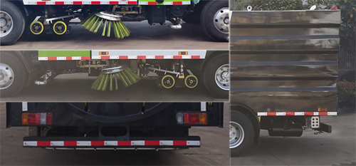 該車裝備有垃圾箱、水箱、洗掃刷等專用裝置,用于清掃、 清洗垃圾等污物;側(cè)防護由專用裝置替代,后下部防護材料為Q235A碳鋼,與副梁采用焊接連接, 截面尺寸:50×120(mm),離地面高度400mm;ABS及其控制器型號為:1、 CM4XL-4S/4M,生產(chǎn)廠家為:廣州瑞立科密汽車電子股份有限公司; 2、APG3550500A,生產(chǎn)廠家為:浙江亞太機電股份有限公司. |
