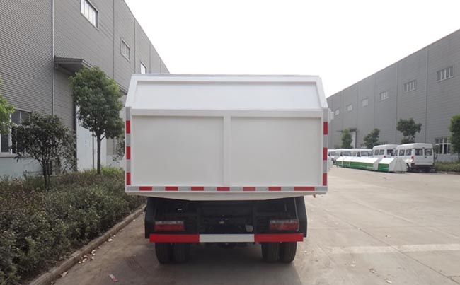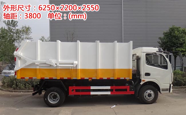 容積7~8立方米,方形密封式箱體,材質邊三底四,國產(chǎn)油泵、多路閥、取力器、液壓油缸,駕駛室外部操作,箱體底部雙杠液壓舉升卸料,箱體后門液壓開啟。