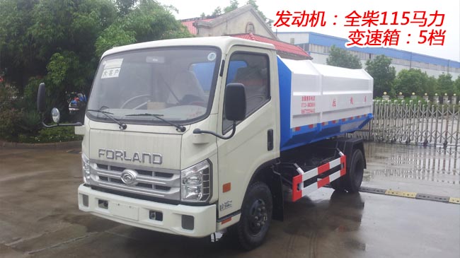 福田康瑞掛桶式垃圾車,康瑞車身、1860mm寬單排前翻駕駛室、全柴115馬力發動機,5檔、7.00R16鋼絲胎、動轉、ABS、可調方向盤、電控熄火。