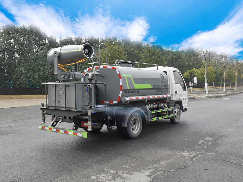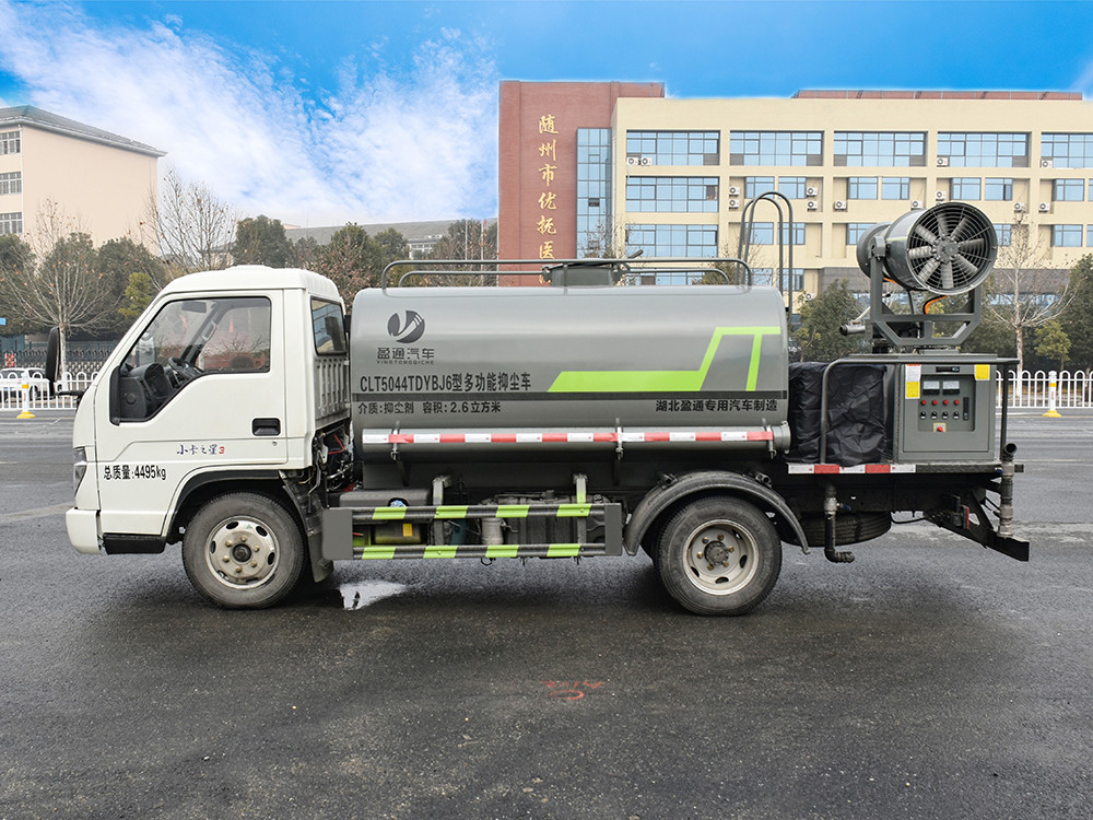 縱昂牌 CLT5044TDYBJ6A 型多功能抑塵車標配后對沖、后灑、側 噴、后置式工作平臺,平臺上配置綠化水炮可 360°旋轉,既可以調成柱狀, 也可以調成霧狀),配備優質大功率專用灑水泵,可自吸自排,可從河里或池 塘抽水到罐體,取力器,雜物過濾網,消防接口,自流球閥系統、取力器、球 閥、濾網均為國家標準產品,主管道加粗,法蘭墊、法蘭盤加厚,大通徑球閥。 整體具備性能優良安全可靠、效率高、流量大、維修方便等特點。