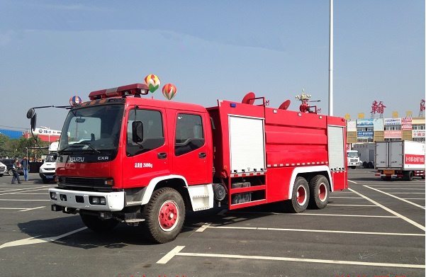 五十鈴11-12噸雙橋消防車采用慶鈴QL1250WPFZY底盤改裝,平頭雙排駕駛室,五十鈴6HK1-TCH發(fā)動機,300馬力,罐體容積11-12立方米(水罐容積8立方米,泡沫罐容積3立方米);整車結(jié)構(gòu)緊湊,方便靈活,動力性能好,車速高,能自由進出鄉(xiāng)村狹窄道路及小區(qū),具有大型消防車的全套消防功能,上裝箱體的上裝骨架全部采用引進歐洲技術(shù)生產(chǎn)的鋁合金型材制造,整車的重量減少,機動性能和整車載重量提高。除了裝備消防水泵及器材以外,還設有較大容量的貯水罐及水槍、水炮等。可將水和消防人員輸送至火場獨立進行撲救火災。也可以從水源吸水直接進行撲救,或向其他消防車和滅火噴射裝置供水。在缺水地區(qū)也可作供水、輸水用車,主要適用于大中城鎮(zhèn)、鄉(xiāng)村狹窄街道、城市小區(qū)、繁忙的批發(fā)市場等場所的一般物質(zhì)滅火,閑暇時可用于園林噴灌、道路清灑。