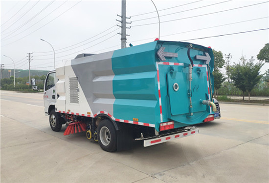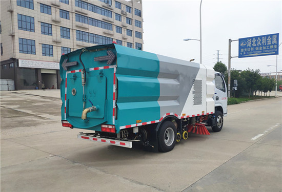 該洗掃車采用國六東風(fēng)多利卡二類底盤改裝,加裝副發(fā)動機(jī)、風(fēng)機(jī)、清水箱、垃圾箱、左右立掃、掃盤降塵系統(tǒng)、左右高壓側(cè)噴高、吸盤內(nèi)置高壓主噴桿、氣動系統(tǒng)、液壓系統(tǒng)、專用裝置電控系統(tǒng)和副車架等改裝而成。
