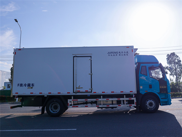 解放J6L 6米8冷藏車廂體配置為:斷橋隔溫工藝,整體結構框架,內外面料為3mm新款啞光玻璃鋼夾保溫層真空復合而成,廂體厚度為8cm,最新款鋁合金包邊型材,型材局部厚度為4mm(鋼制鉚釘加固),廂體內部采用2個LED照明燈及廂體示寬燈,后門框不銹鋼材質,門框密封條為三元乙丙橡膠材質,加厚型不銹鋼合頁及鎖件;副梁為Q700車用大梁鋼,15mm厚大梁墊皮,加裝防撞膠塊,不銹鋼門鎖件,配后雙開門,副駕駛一側居中靠前開單側門一個,帶2個排水孔。